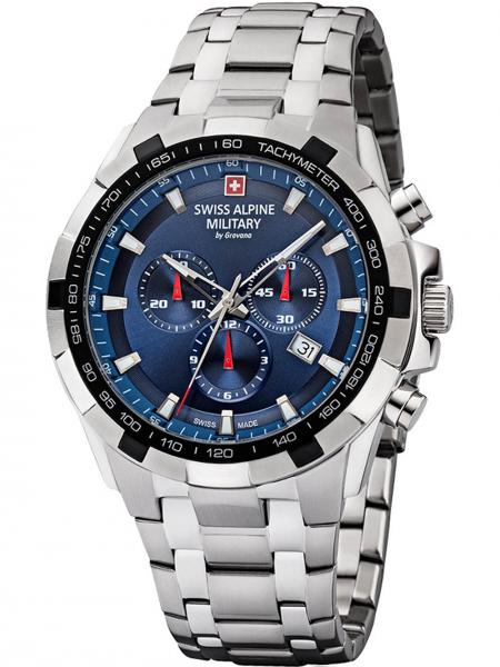 Swiss Alpine Military Star Fighter kronograaf meeste käekell. Roostevabast terasest korpus ja kellarihm 20cm x 25mm. Sinine sihverplaat kuupäeva näidikuga. Pimedas helendavad seierid ja indeksid. Veekindel 10 ATM (ujumine/snorgeldamine).